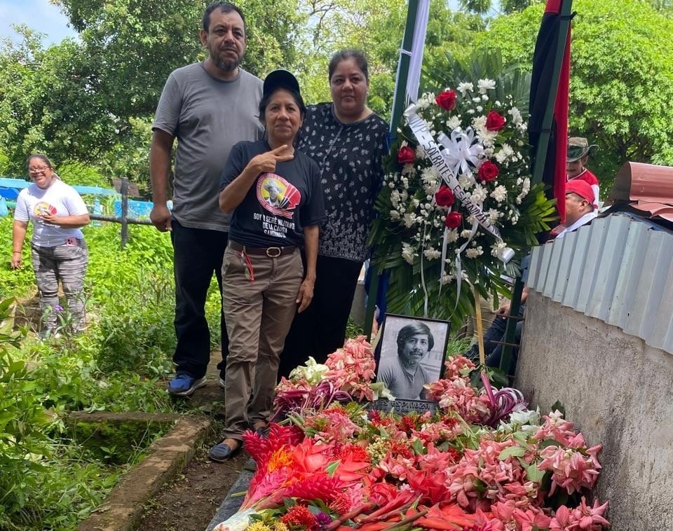Nicaraguan revolutionary Sócrates’ sister Abigail (in front), son Edwin and daughter Paola, at his grave on June 28, 2025. Photo: John Perry.