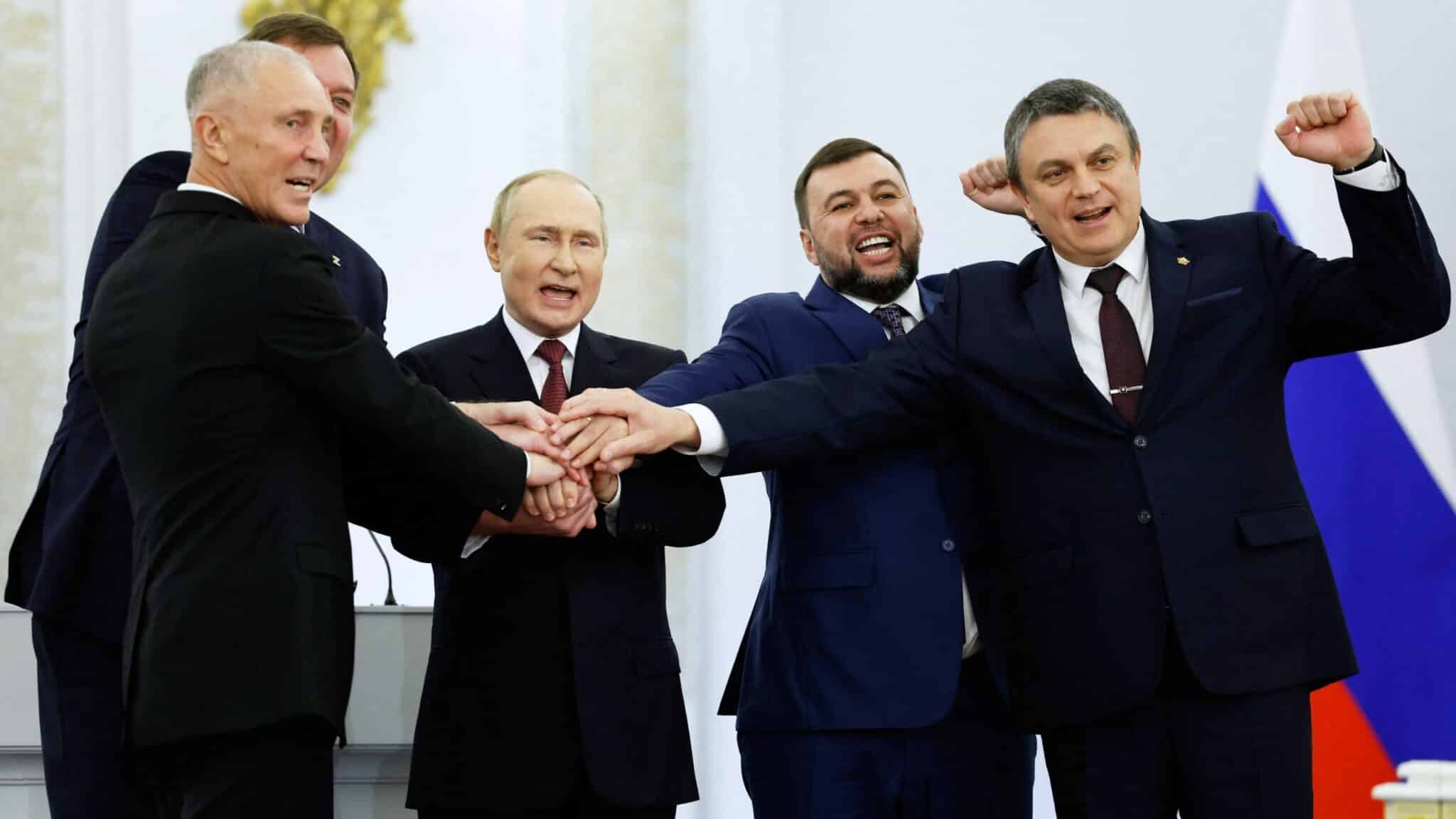 From left, head of Kherson Region Vladimir Saldo, head of Zaporizhzhia region Yevgeny Balitsky, Russian President Vladimir Putin, Denis Pushilin, leader of the Donetsk People's Republic and Leonid Pasechnik, leader of Luhansk People's Republic, pose for a photo during a ceremony to sign the treaties for the four regions to join Russia,. Photo: Dmitry Astakhov/Sputnik/Government Pool/Via AP.