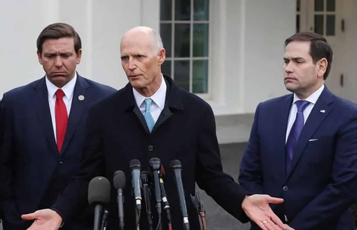 Senator Rick Scott giving statements to the press outside the White House, escorted by Senator Marco Rubio and Florida Governor Ron DeSantis. Photo: Phil Ammann.