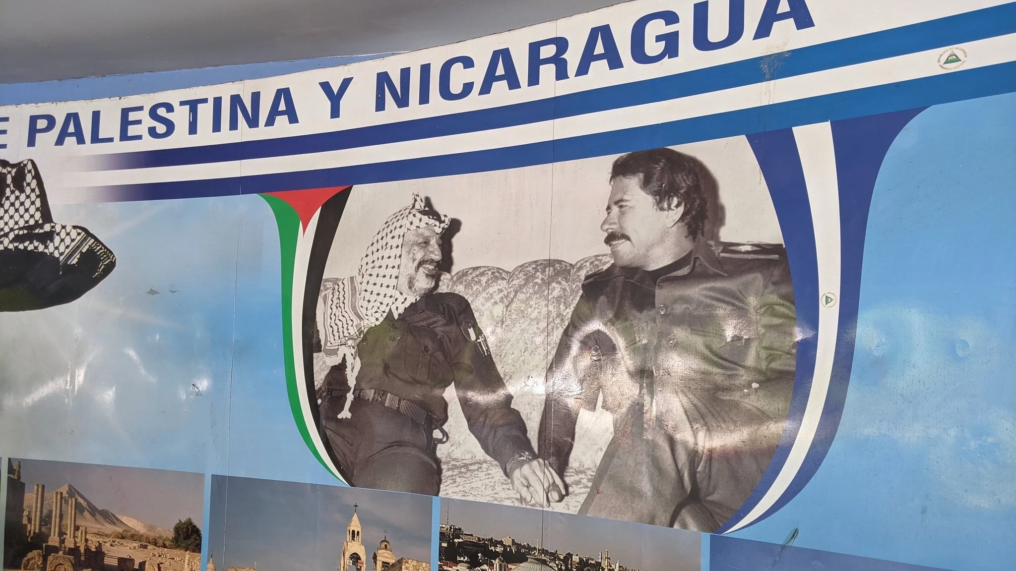 Poster on Nicaragua-Palestine relations, featuring the late Palestinian leader Yasser Arafat (left) and Nicaraguan President Daniel Ortega (right) during the latter's state visit to occupied Palestine in 1981. Photo: X/@BenjaminNorton.