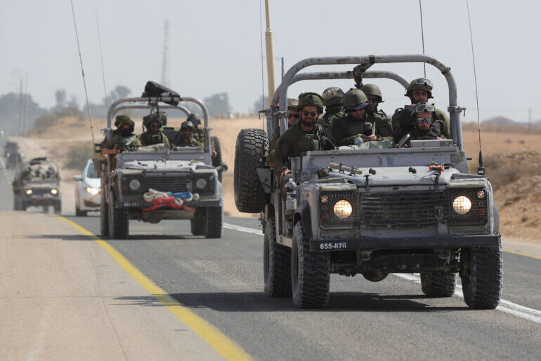 Israeli soldiers drive along the border with Gaza near the Southern city of Ofakim, October 11, 2023. Photo: Abir sultan/Efe via Zuma Press/APA images.