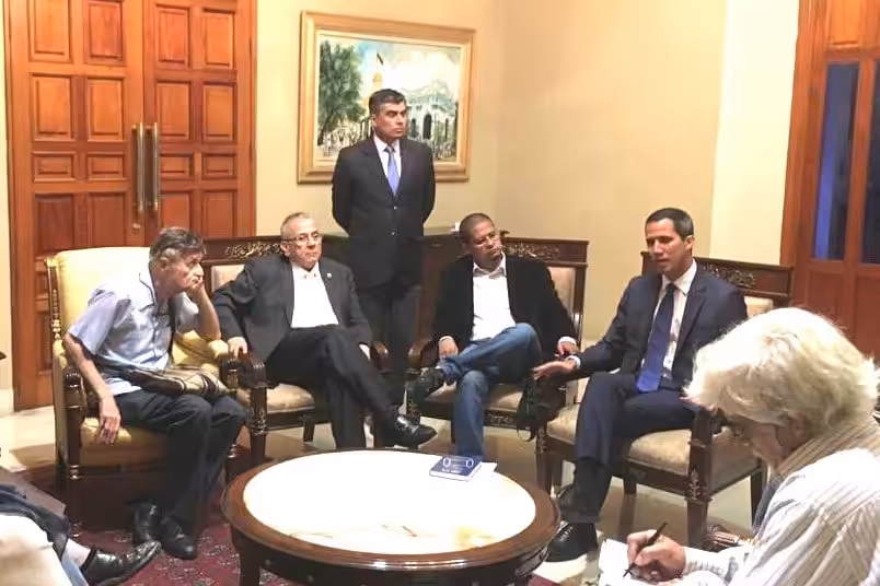 Featured image: Nicmer Evans next to self-proclaimed Juan Guaido on February 5th, 2019, in a meeting with self described “former Chavistas”.