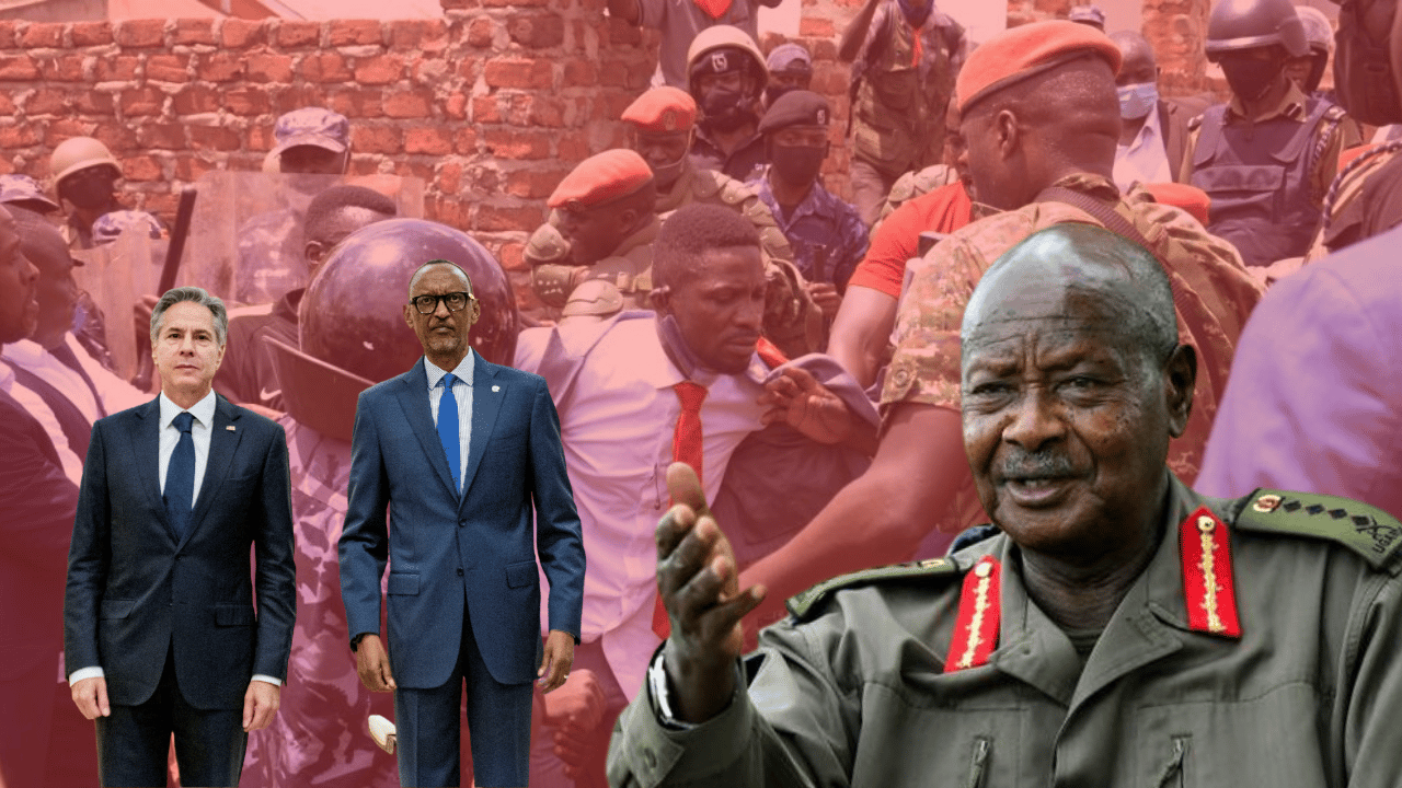 On left: U.S. Secretary of State Antony Blinken with Rwandan President Paul Kagame. On right: Ugandan President Yoweri Museveni. Background: National Unity Platform presidential candidate Bobi Wine. Toward Freedom. File photo.
