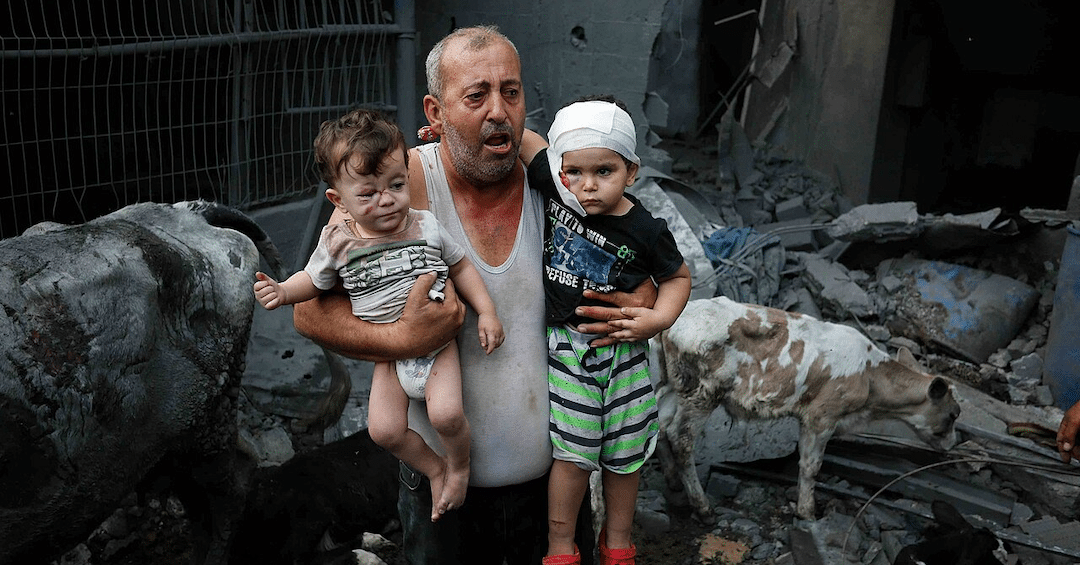 A Palestinian refugee carries his injured grandchildren from the Israeli bombing of Nuseirat Camp, Gaza Strip. Photo: Ashraf Amra/2023 UNRWA.