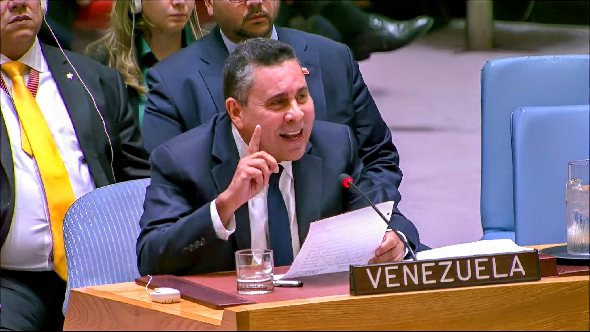 Venezuela's UN Ambassador Samuel Moncada condemning US military threats at the UN Security Council on October 10, 2025. Photo: Upscale image from UN footage.