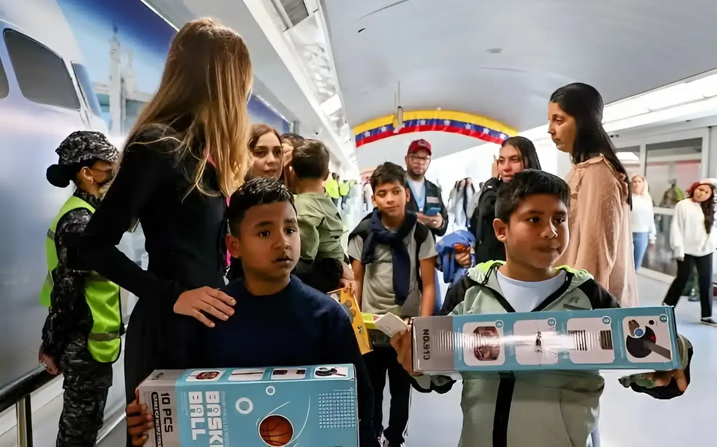 Camilla Fabri, head of the Return to the Homeland Plan, greets and gives toys to the migrant children arriving back home on flight 67. Maiquetia, Friday, September 12, 2025. Photo: IG/@minjusticia_ve.