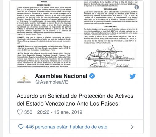 In its Twitter account, the National Assembly released the decree in which it agreed “to request the countries of Argentina, Brazil, Canada, Chile, Colombia, Costa Rica , Guatemala, Guyana, Honduras, Panama, Paraguay, Peru, the United States, Bulgaria, Russia, China, Turkey, the United Arab Emirates and the European Union that instruct the regulatory bodies of financial entities to expressly prohibit any management of liquid assets of the Venezuelan State in the accounts accredited in those countries in order to guarantee the protection of the assets of the Venezuelan State for not having the State of Venezuela legal representation before the regulatory entities.”