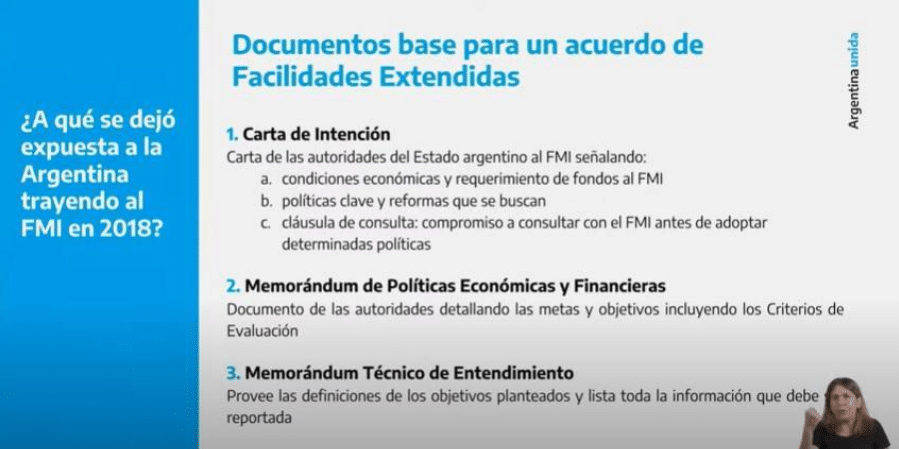 The legal framework There is also no precision about the legal framework of the agreement. In his presentation on January 5, Guzmán explained for the first time all the steps to be taken. The Memorandum of Economic and Financial Policy is only one of the required documents. The others are the Technical Memorandum of Understanding, which is where the negotiation seems to be stuck, and finally the Letter of Intent.