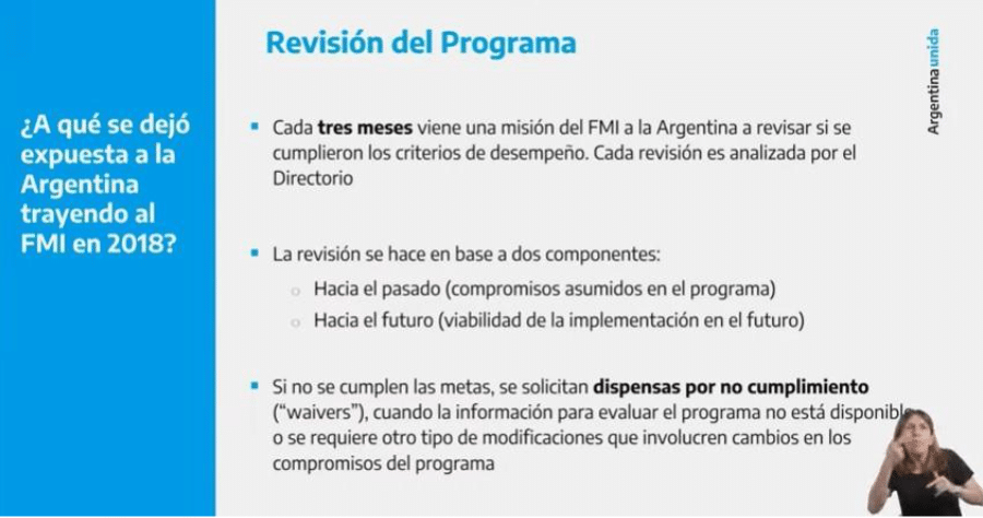 This implies that Argentina will suffer quarterly reviews by the IMF for the next 12 years. As Guzmán explained to the governors, the quarterly reviews include a retrospective aspect, about what has already been done, and a prospective aspect, about the possibility of fulfilling the commitments in the future.