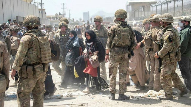 Featured image: Two Afghan women walking near Kabul airport surrounded by US soldiers. Photo: Telesur / Getty Images.