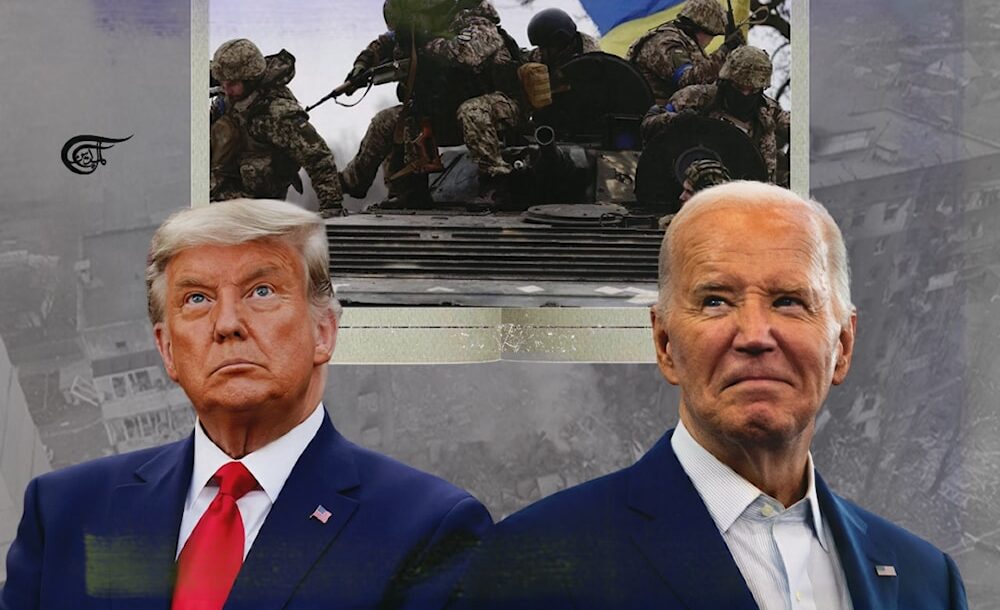 US President Donald Trump (left), former President Joe Biden (right) and Ukrainian troops (background). Photo: Batoul Chamas/Al Mayadeen English.