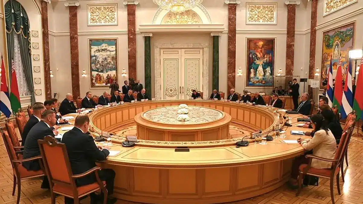 Belarusian President Aleksandr Lukashenko and Cuban President Miguel Díaz-Canel Bermúdez among their respective delegates at a meeting in Minsk, June 25, 2025. Photo: @PresidenciaCuba/X.