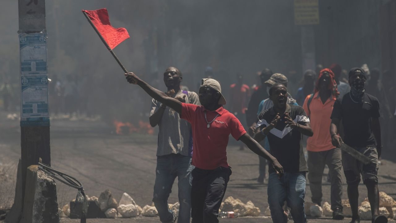 A man waves a red flag during a protest against fuel price hikes. Photo: AP/Odelyn Joseph.