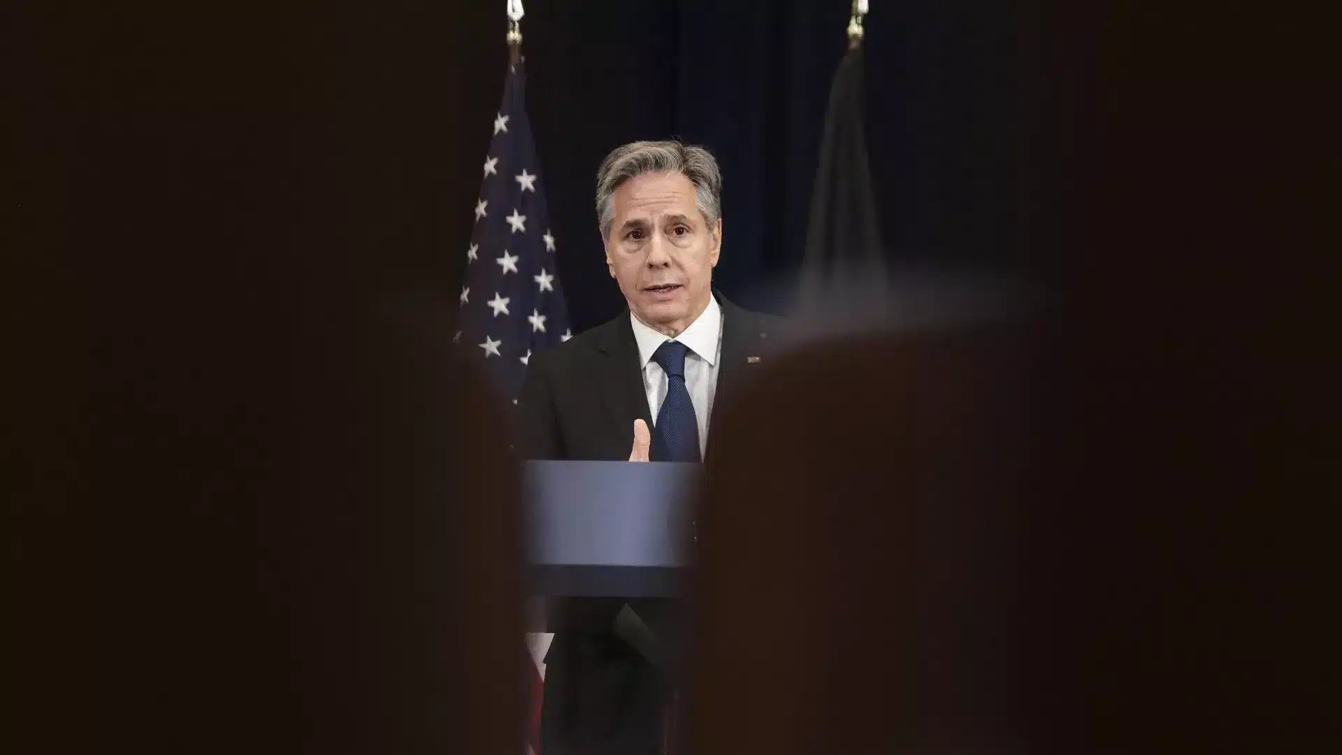 Antony Blinken giving a press briefing, 2023. Photo: Oliver Contreras/AFP.