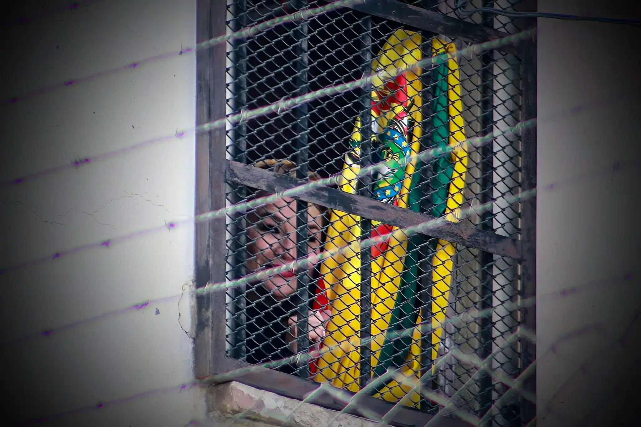 Former Bolivian dictator Jeanine Áñez holds a Bolivian flag from a window on Monday, August 25, at the Miraflores Women's Orientation Center in La Paz, Bolivia. Photo: Gabriel Márquez/EFE.