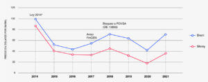The price differential between Venezuelan Merey crude oil and Brent reached discounts of up to 40% in 2018, with sales prices of US $18 per barrel in 2020 compared to US $41 for the international benchmark.