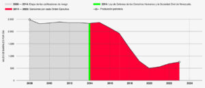 The second blow came in January 2019 with the designation of PDVSA (Venezuela’s publicly owned petroleum company) as a sanctioned entity and the recognition of the parallel government of Juan Guaidó, which caused an additional contraction of 35.2% in production between January and March of that year.