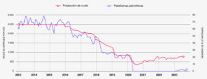 Oil platforms and crude oil production in Venezuela: graph made with public data. Photo: Misión Verdad.