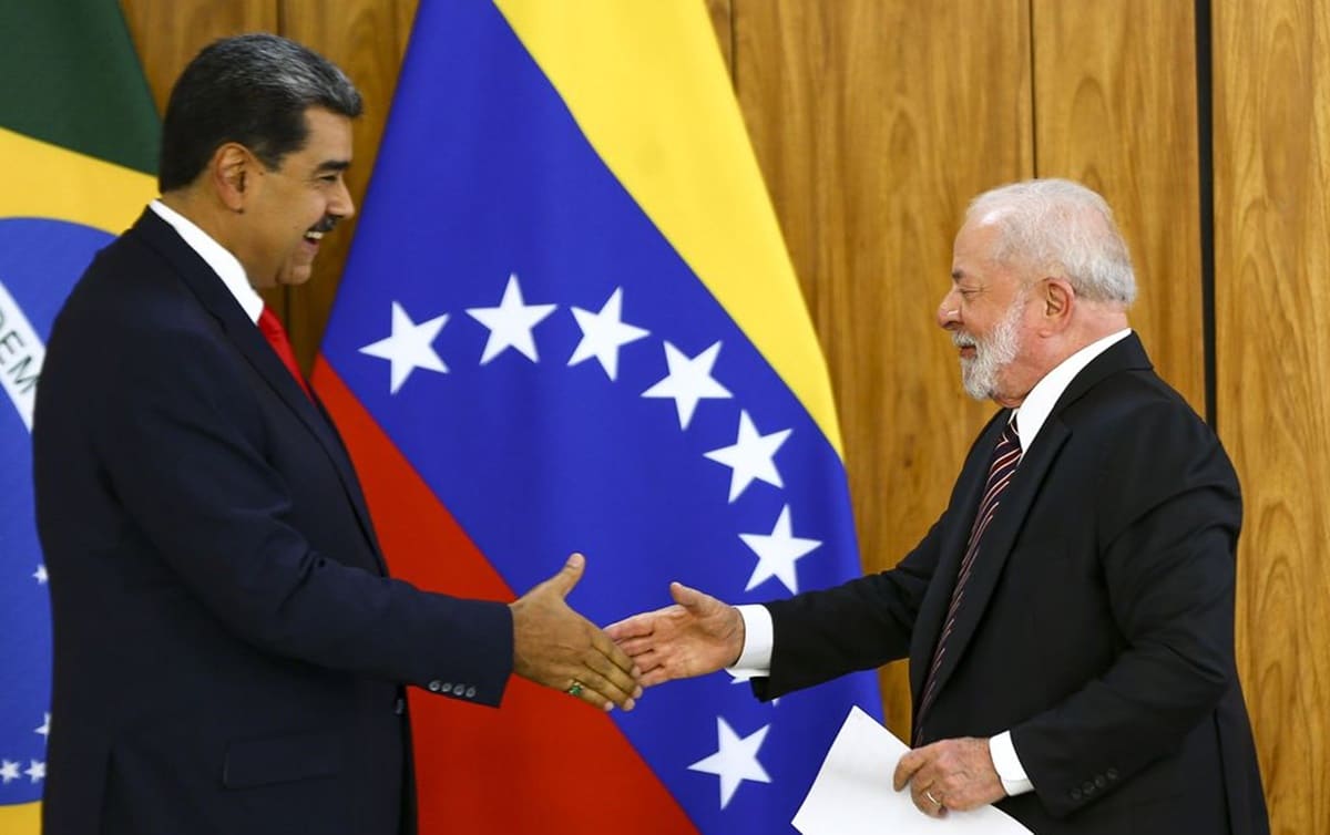Brazilian President Luiz Inácio Lula da Silva shaking hands with Venezuelan President Nicolás Maduro at the Planalto Palace, Brasília, during a press conference following an extended meeting marking the resumption of full diplomatic relations between the two countries. Photo: Marcelo Camargo/Agência Brasil.