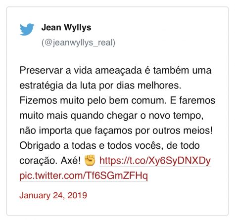 Bolsonaro made no explicit comment on Wyllys’s announcement, but soon after posted a thumbs-up emoji on his twitter feed. Bolsonaro’s son Carlos – also a Rio city councilman – greeted the news with a tweet saying: “Go with God and be happy.”