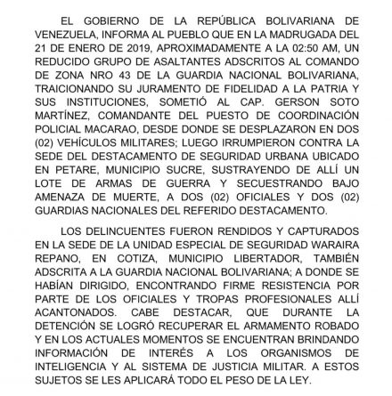 Through a communiqué issued by the Ministry of Popular Power for Defense and read in the channel of the Venezuelan State of Television, the capture of a group was reported of troops of the Bolivarian National Guard (GNB) who, on Monday morning, kidnapped the commander of the police coordination post in Macarao (Caracas), stole a batch of weapons from the Petare urban security center (Caracas) and kidnapped two officers and two troops of the GNB. The troops went to the Special Security Unit Waraira Repano in Cotiza (Caracas), where they met with strong resistance and were finally subdued and captured, recovering their weapons. At this time, they provide information to the security forces.