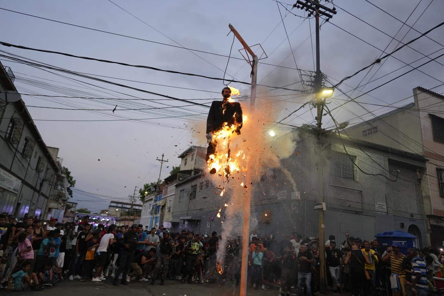 Residents burn a hanging "Judas" with a sign in Spanish that reads, "The Corrupt," in Caracas, Venezuela, April 9, 2023. Photo: AP/Ariana Cubillos.