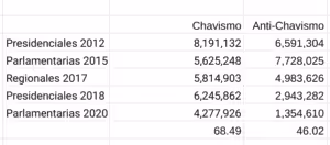 Many Chavista analysts have call for a debate to analyze a drop in votes for the PSUV/GPP, that went from 6,245,862 in the 2015 parliamentary elections to 4,277,926 this year, a 31.5 percent drop. But an analysis made by Orinoco Tribune of opposition votes in the same two elections—using Wikipedia as a source—reveals a far worse performance by anti-Chavismo: a 54% drop in the number of votes they secured.