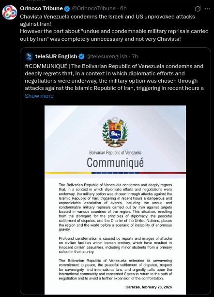 The Bolivarian Republic of Venezuela condemns and deeply regrets that, in a context of ongoing diplomatic efforts and negotiations, the military route was chosen through attacks against the Islamic Republic of Iran, triggering in recent hours a dangerous and unpredictable escalation of events, including undue and condemnable military reprisals by Iran against targets in various countries of the region. This situation, resulting from a disregard for the principles of diplomacy, the peaceful settlement of disputes, and the Charter of the United Nations, places the region and the world in a scenario of enormous instability.