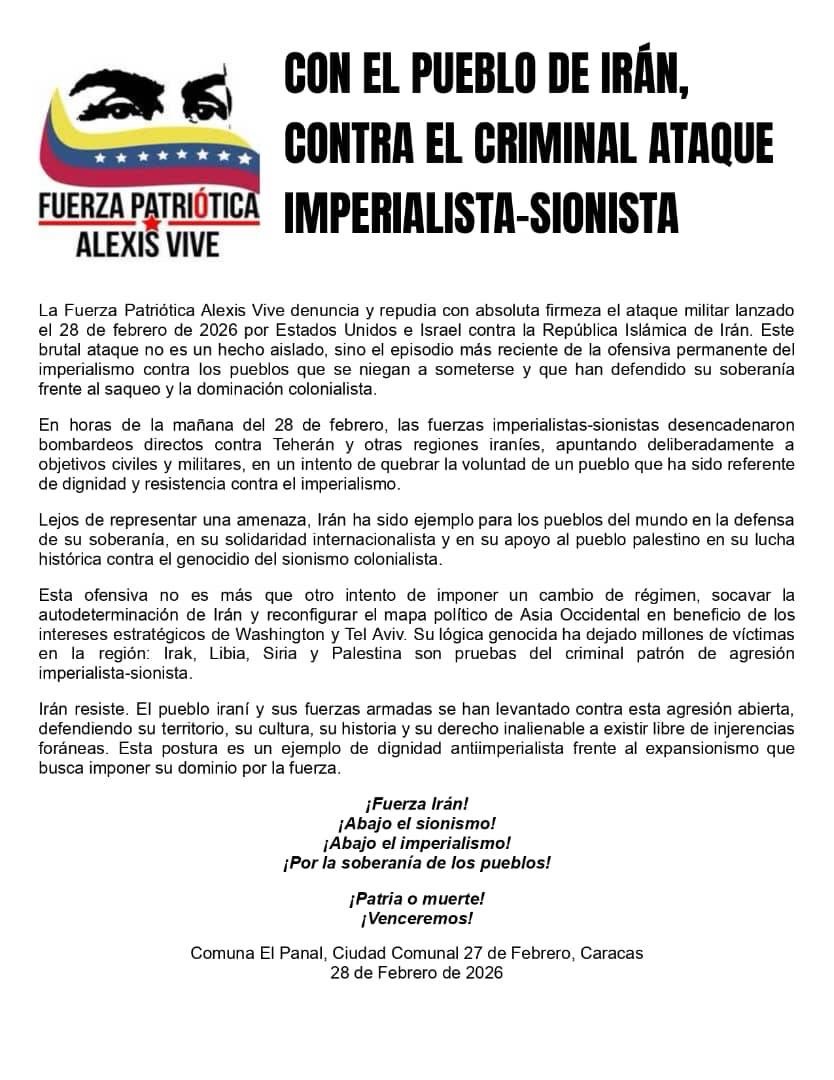 The Alexis Vive Patriotic Force denounces and repudiates with absolute firmness the military attack launched on February 28, 2026, by the US and “Israel” against the Islamic Republic of Iran. This brutal attack is not an isolated event, but the latest episode of the permanent offensive of imperialism against peoples who refuse to submit and who have defended their sovereignty against looting and colonialist domination.