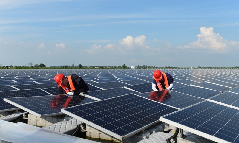Engineers conduct maintenance work at a floating solar farm in Panji District of Huainan City, east China's Anhui Province, July 20, 2021. Photo: Xinhua.