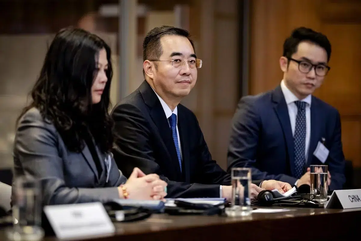 Ma Xinmin (center), Director General of the Department of Treaty and Law of China's Ministry of Foreign Affairs, attends a hearing at the International Court of Justice in The Hague on the legal consequences of the Israeli occupation of the Palestinian territories, on February 22, 2024. Photo: Robin van Lonkhuijsen/ANP/AFP.