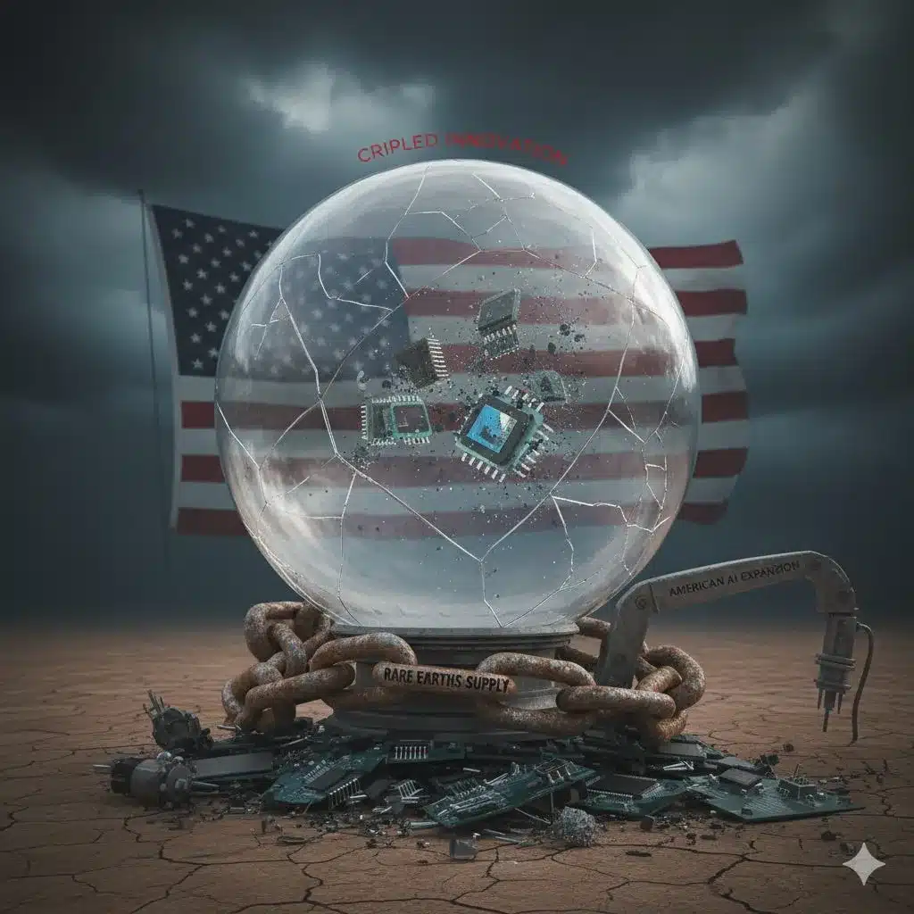 This artwork is a symbolic commentary on the state of American technological innovation and its dependency on rare earth minerals. The central focus is a cracked, transparent sphere with an American flag visible inside. Floating within the sphere are various electronic components, including computer chips, representing American AI expansion. A heavy, rusty chain labeled "RARE EARTHS SUPPLY" is wrapped around the base of the sphere, appearing to hold it in place and suggesting a potential constraint on the technology. A robotic arm labeled "AMERICAN AI EXPANSION" extends toward the sphere, and the entire structure rests on a bed of discarded circuit boards and other electronic waste in a barren, cracked desert landscape under a stormy sky. The phrase "CRIPLED INNOVATION" is written in red text above the sphere. Photo: Substack.