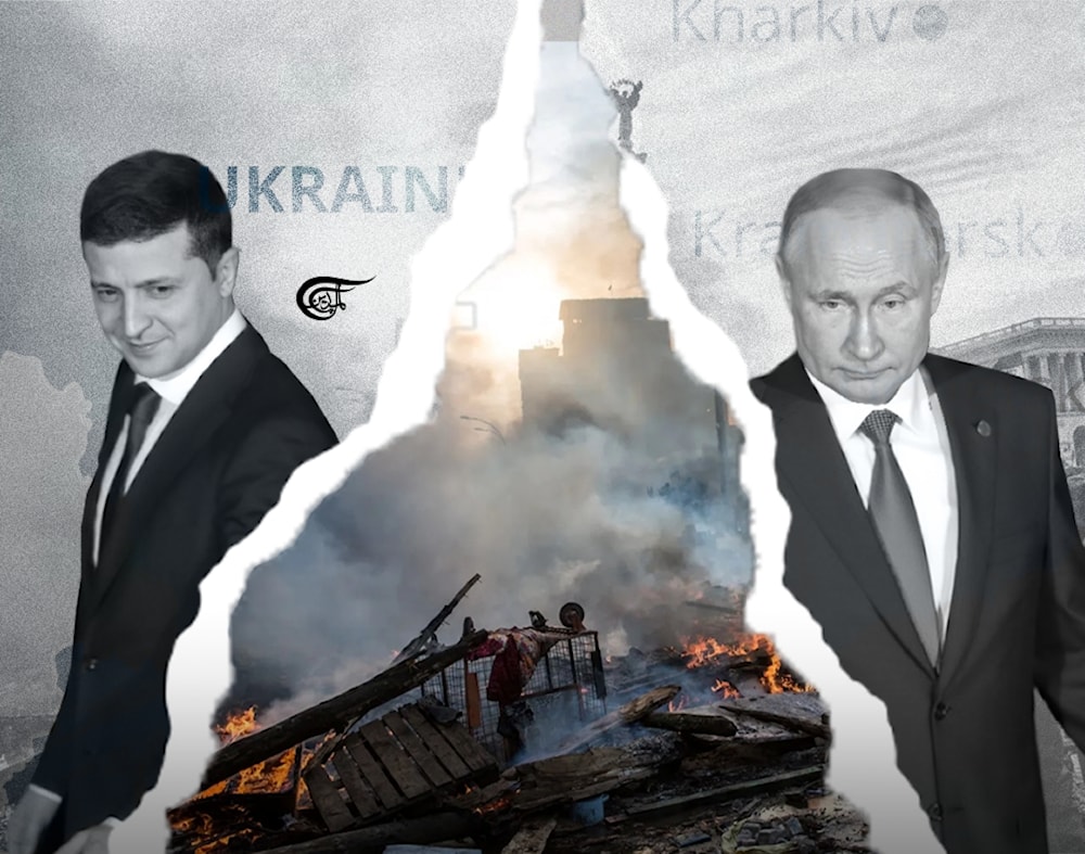 Photo composition: President Volodymyr Zelensky (left), President Vladimir Putin (right) and the destruction left by the war (middle). Photo: Batoul Chamas/Al Mayadeen English.