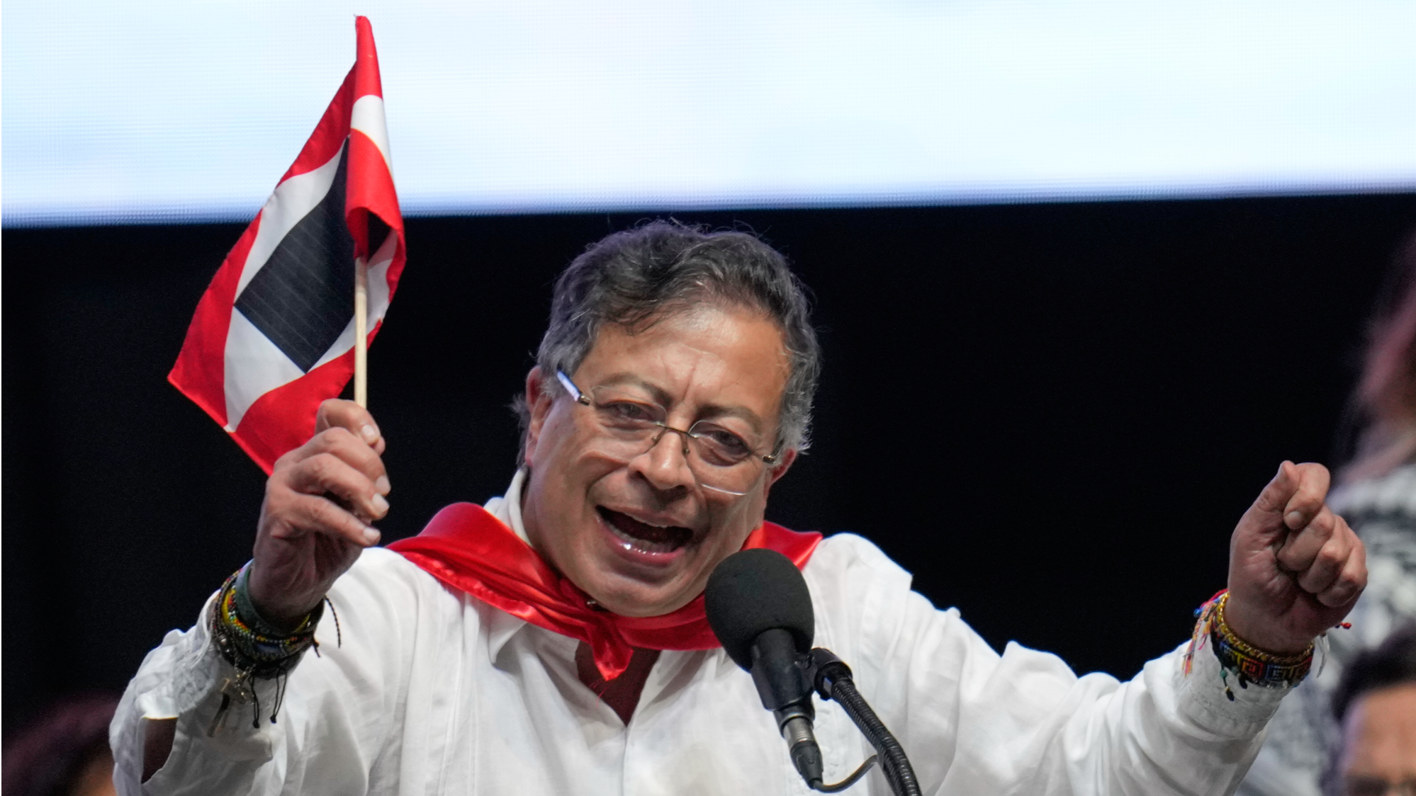 Colombian President Gustavo Petro holds the flag of Liberator Simón Bolívar's independence army at a public event, October 2025. Photo: Presidency of Colombia.