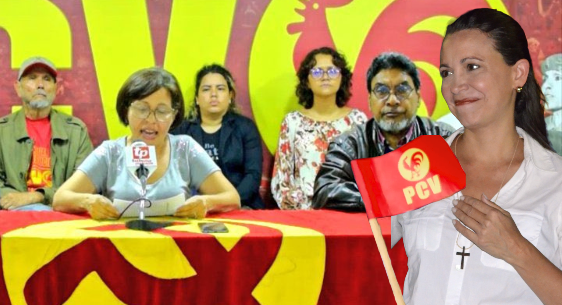 Photo composition showing PCV leadership questioning the attacks on the far-right politicians that requested US military invasions and illegal sanctions, next to an image of opposition primaries pre-candidate María Corina Machado with a thankful expression next to a PCV hand flag. Photo: Orinoco Tribune.