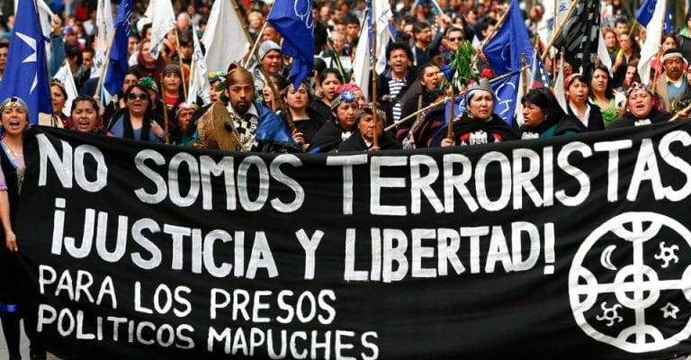 Indigenous Mapuche activist in a street protest holding a banner that reads: "We are not terrorists! Justice and freedom for Mapuche political prisioners." Photo: IWGIA.