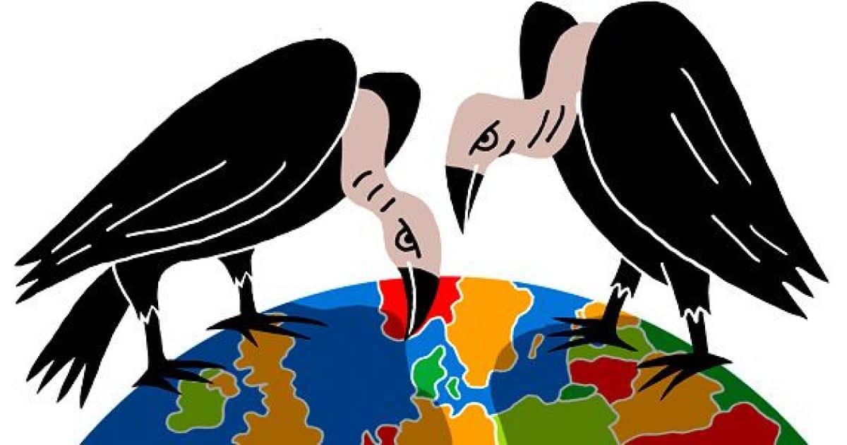 Animation of two vultures towering over the Earth, representing vulture funds. Photo: Luba Lukova.