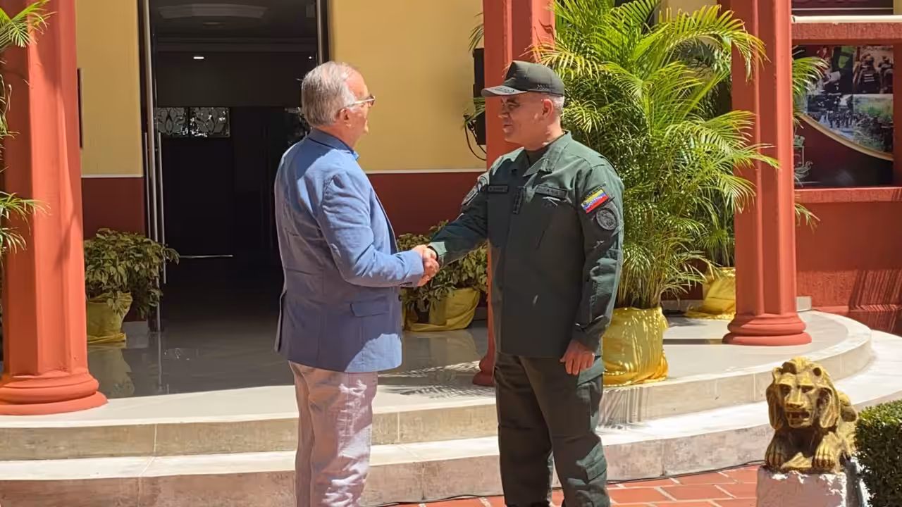 Colombian Defense Minister Iván Velásquez (left) and Venezuelan Defense Minister Vladimir Padrino López (right) meet at the Colombia-Venezuela border. Photo: Twitter/@AABenedetti