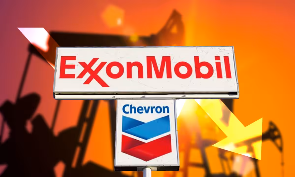 Hoardings showing the names and logos of ExxonMobil and Chevron in the backdrop of a silhouette of oil extraction machinery. Photo: El CEO.