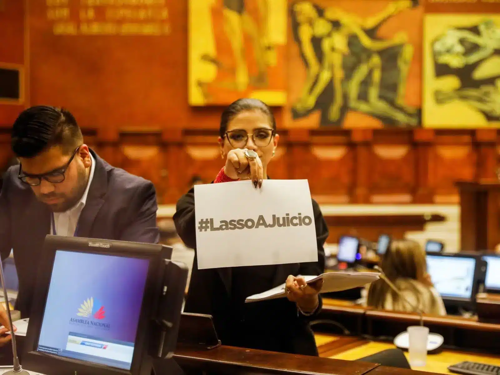 A woman holds a piece of paper that reads "Lasso On Trial" in the National Assembly of Ecuador, this Saturday, March 25, 2023. Photo: Karen Toro/Reuters.
