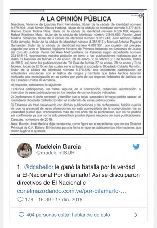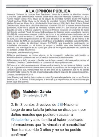 Recently, coincidently, Cabello had stated that he wouldn’t publicly excuse neither the owner of El Nacional, Miguel Henrique Otero, nor the director of La Patilla, Alberto Federico Ravell, nor the owners of Tal Cual for this defamation attempt. “I neither forgive them, nor accept their apologies, nor anything, because they mounted a large fake news against a human being without any proof”, said Cabello a few days before the public letters were published.
