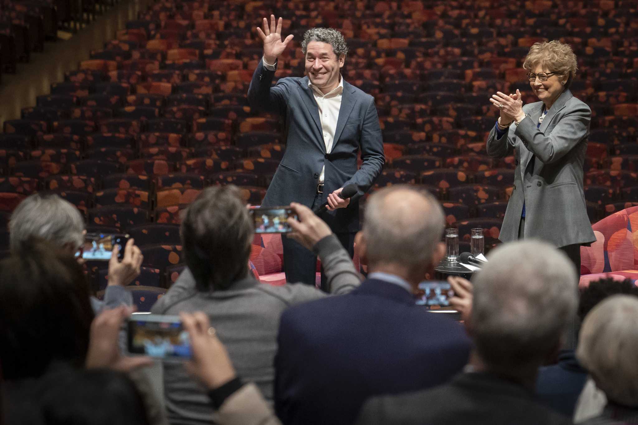Internationally acclaimed Venezuelan conductor Gustavo Dudamel (left) and the president of the New York Philharmonic, Deborah Borda (right) at a press conference this Monday, February 20, 2023. Photo: John Minchillo/AP.
