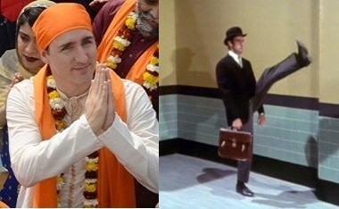 We haven’t even got to Justin’s physical deformity, being mysteriously born with two left feet. During a visit to India, Trudeau dressed as if for Halloween, and for his party prank