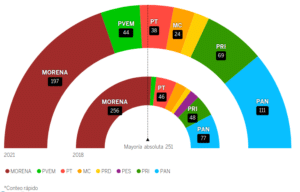 According to the preliminary results of the quick vote count published on Sunday night by the National Electoral Institute (INE), the coalition formed by the ruling party National Regeneration Movement (MORENA) and allies, the Workers’ Party and the Ecological Green Party, obtained 41.8% of the votes in the Chamber of Deputies, while the opposition bloc formed by the Institutional Revolutionary Party (PRI), the National Action Party (PAN), and the Democratic Revolutionary Party (PRD) won 41.5% of the votes.