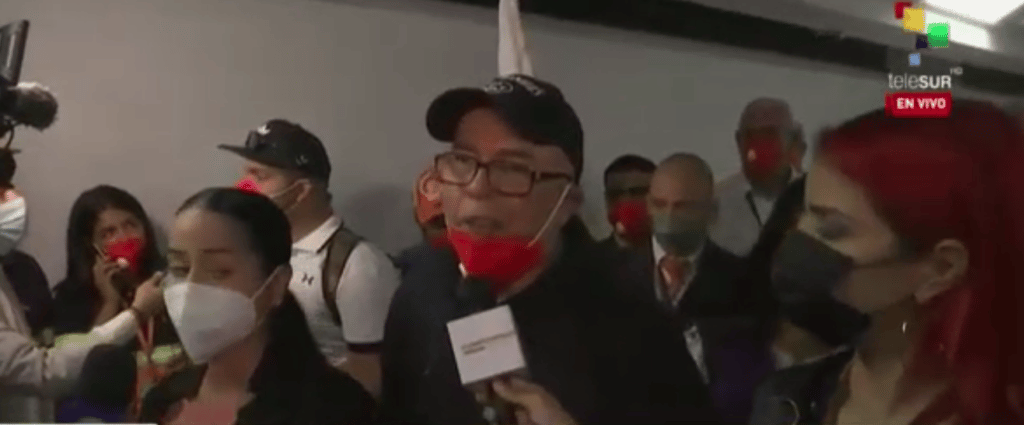 Freed Emtrasur crew members talk to reporters in an airport lobby. The 12 made a stopover in Bolivia before arriving in Venezuela.
