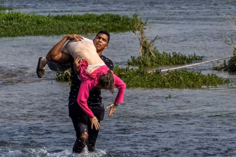 Young Venezuelan (Cesar Padron) helping and older woman to cross the Rio Grande, a photo used to magnify Venezuela's migration issue. File photo.