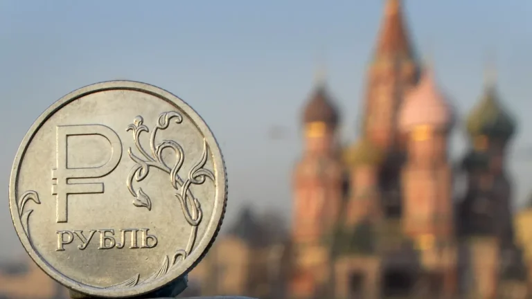 Photo composition: A Russian ruble coin (front) and St. Basil cathedral in central Moscow (background). Photo: Alexander Nemenov/AFP.