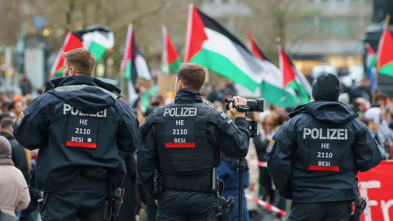 German police confronts a pro-Palestine demonstration. Photo: Andreas Arnold/Getty Images.