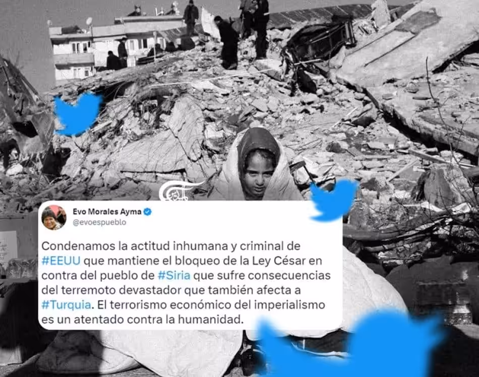 Photo composition showing a little girl covered with a blanket in front of a collapsed building next to a tweet by Evo Morales criticizing US sanctions making emergency response more complicated for Syrian citizens. Photo: Al Mayadeen.
