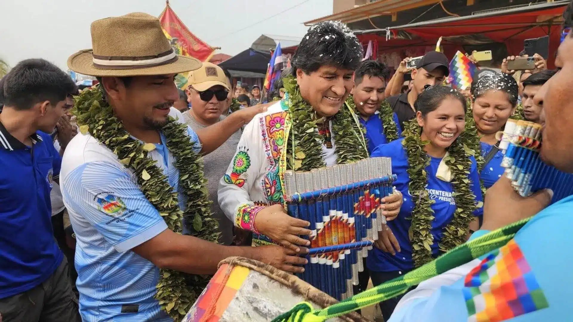 Evo Morales holding a panpipe and wearing a garland as he stands among a crowd. Photo: Telegram/Sputnik Mundo.